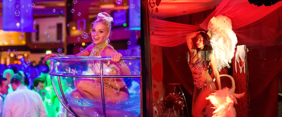 Zoekt u een Poederdoos-act, een Schommel act, danseressenin de Las Vegas-stijl, een mooie danseres in een gigantisch groot Champagneglas, om op de muziek van de dj mee te dansen op een besloten feestje of een bedrijfsfeest?